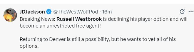 北京时间6月13日,NBA记者马克-斯坦恩透露,掘金后卫拉塞尔-威斯布鲁克拒绝执行赛季340万的球员选项,他将在7月1日成为完全自由球员涉水自由市场。